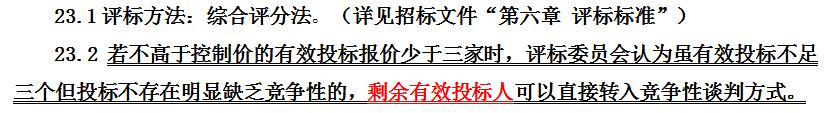 若不高于控制價(jià)的有效投標(biāo)報(bào)價(jià)少于三家時(shí),評(píng)標(biāo)委員會(huì)認(rèn)為雖有效投標(biāo)不足三個(gè)但投標(biāo)不存在明顯缺乏競(jìng)爭(zhēng)性的,剩余有效投標(biāo)人可以直接轉(zhuǎn)入競(jìng)爭(zhēng)性談判方式。具體修正位置為: